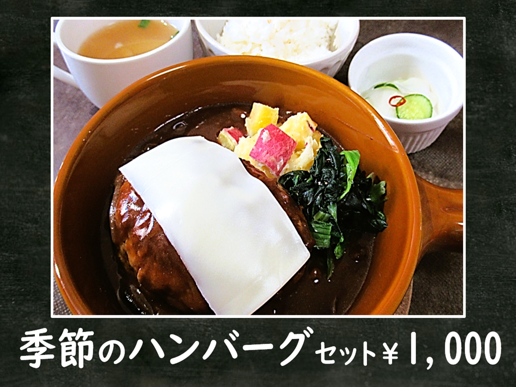・豆腐入りハンバーグ・季節のトッピングとソース・浅漬け・みそ汁・ごはん
