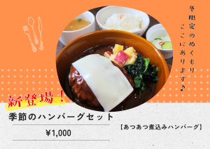 季節のハンバーグ 2026-01-06 | コメントはまだありません 【NEW】季節のハンバーグセット ¥1,000 ・あつあつ煮込みハンバーグ ・ごはん ・みそ汁 ・浅漬け ・ドリンク ~冬限定のぬくもりここにあります♪~