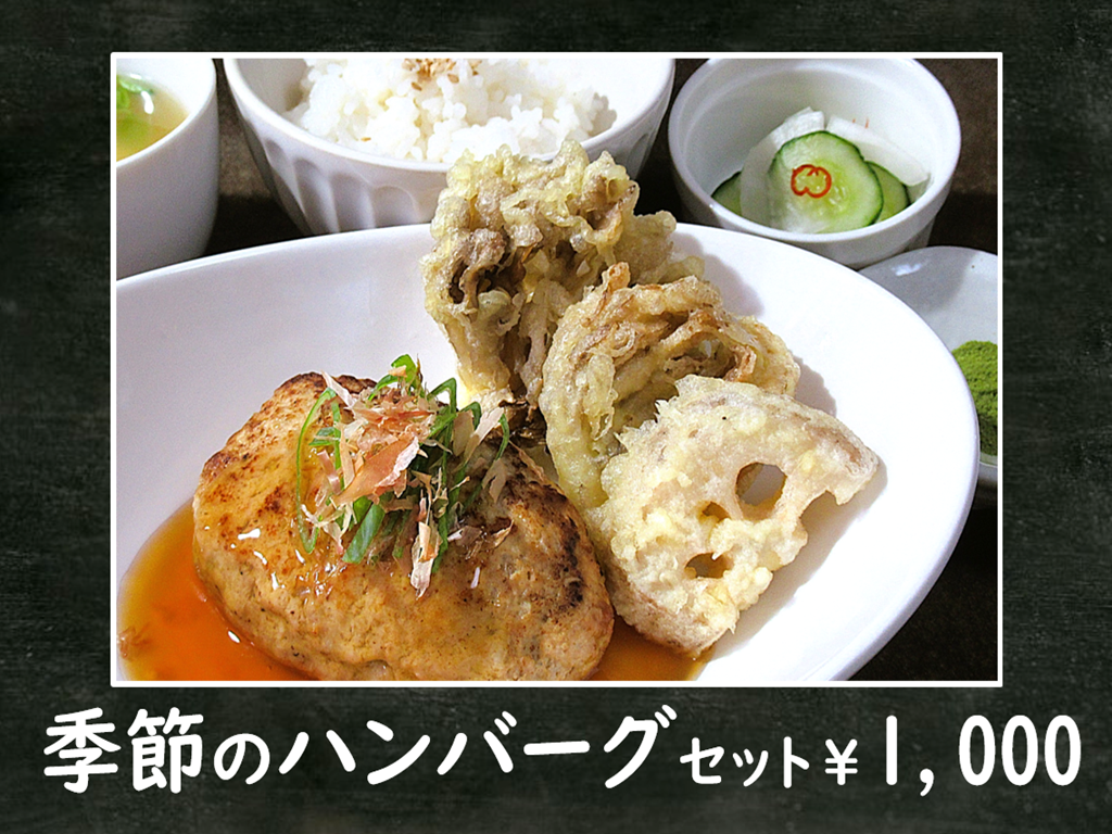 ・豆腐入りハンバーグ・季節のトッピングとソース・浅漬け・みそ汁・ごはん