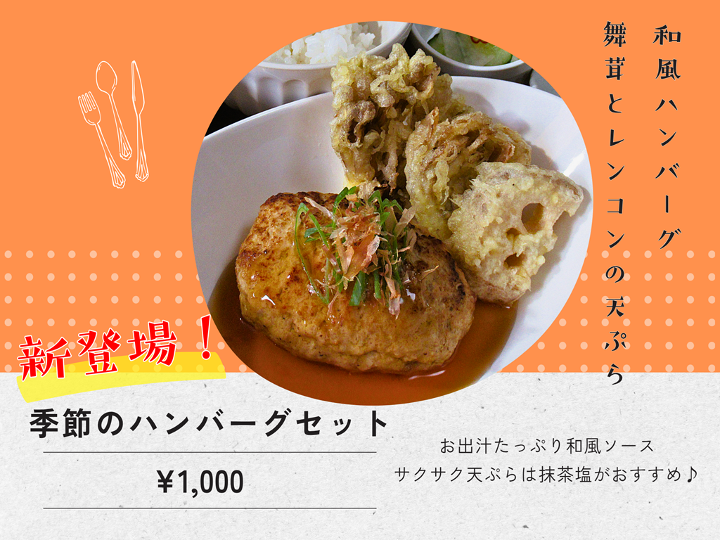 本日より季節のハンバーグが新しくなって登場!和風ハンバーグ・舞茸とレンコンの天ぷら